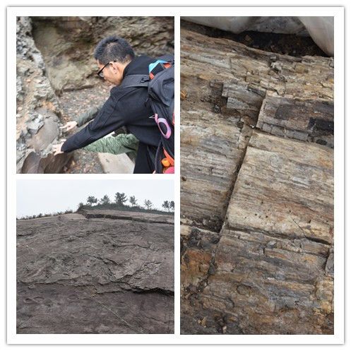 最令我们惊奇的是沿途看到了恐龙的脚印,从带队的专家那里我们得知,恐龙足迹化石属于晚侏罗纪,岩石属于粉砂岩一类。恐龙足印化石的形成需要恐龙生活离水比较近,比如在河海、湖滨等,如果是土层坚硬的话是不会留下足印的。恐龙留下脚印后,需要暴露在空气里一段时间,使得脚印坚固起来,下次泥沙、波浪袭来时,脚印没有被冲掉,随后的这些足迹就保留了下来。至少再过了650万年,这些足迹化石所在的地块因为地壳运动,被抬升起来,得以显露于世人面前,造成了我们面前的这样奇异景观。