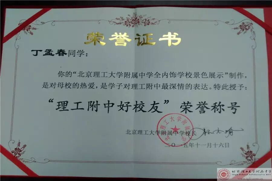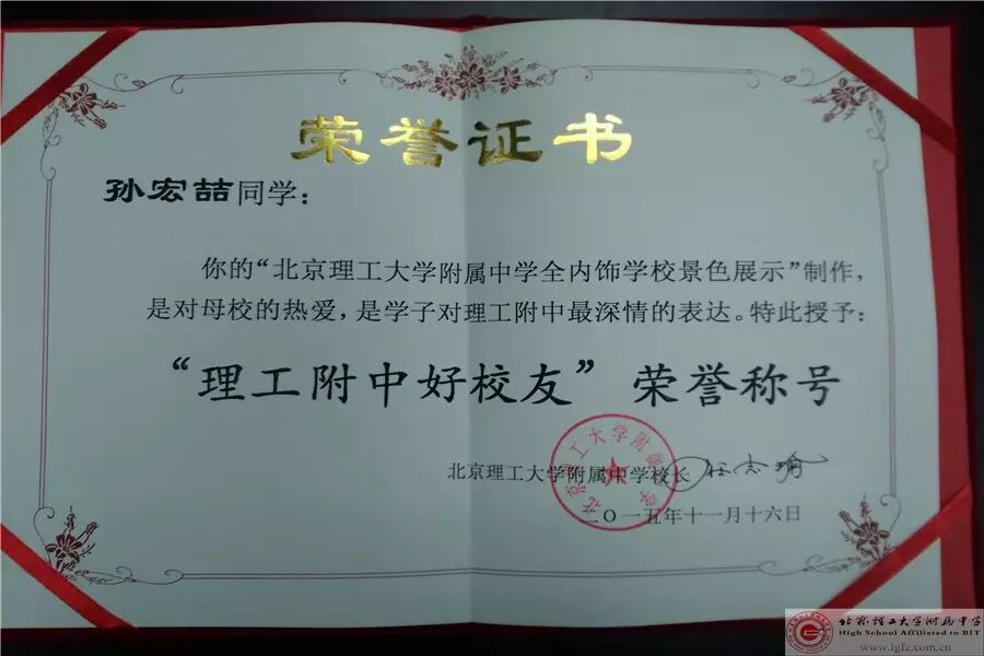 北京理工大学附属中学2015届高中毕业生孙宏喆应理工附中任志瑜校长的邀请,于2015年11月16日上午和他的搭档丁孟春返回母校。孙宏喆在升旗仪式后,与学弟学妹分享了他创作“北京理工大学附属中学全内饰学校景色展示”的历程,还表达了对母校对老师对同学的思念和感谢。随后理工附中任志瑜校长为2015届高中毕业生孙宏喆、丁孟春两位同学颁发“理工附中好校友”荣誉证书,以此鼓励全体学生用自己的方式爱学校、爱老师、爱同学、爱自己,并相信理工附中的校史上会出现愈来愈多的“理工附中好校友”。