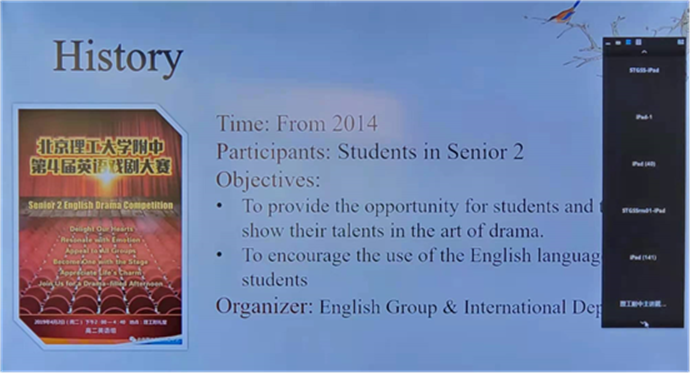 接下来是由来自北京理工附中英语学科的戴滕老师进行分享,她分享的题目是:中学英文戏剧活动。