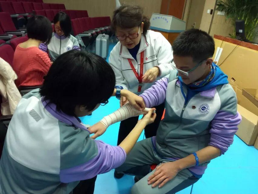 在讲授完理论知识的基础上,分成10个小组,由指导老师分别进行了绷带及三角巾包扎实际应用、操作培训与考核。参加培训的全体师生全部通过了考核要求。