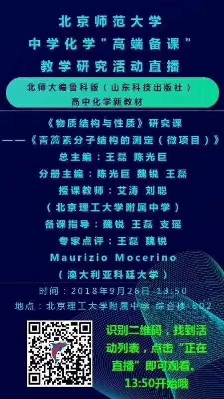 为了促进我校化学学科建设,加强教师对新课程“物质结构与性质”模块的理解和认识,提升化学教师的学科研究和教学能力,推进我校“发现课堂”进程,2018年9月26日下午,北京理工大学附属中学化学组在综合楼602教室开展了“化学教研开放日暨北师大高端备课教学研究活动”。本次研究课由北京理工大学附属中学化学学科主任艾涛和刘聪博士两位老师联袂奉献。本次研究课的课题来源是北京师范大学编写的“新世纪”鲁科版(山东科技出版社)高中化学新教材,选择性必修《物质结构与性质》的第三章的微项目——“青蒿素分子结构的测定”。本次研究课通过创先泰克教育云高清直播共享平台进行全程网络直播。