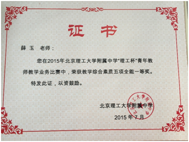历史组薛玉老师在2015年“理工杯”青年教师教学业务比赛中荣获“最优演说家”奖、“优质教案奖”、“优秀说课奖”和教学综合素质五项全能一等奖。