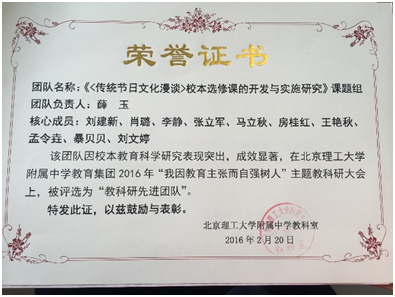 在2016年2月20日的教科研大会上,历史组开发的《<传统节日文化漫谈>校本选修课的开发与实施研究》课题组被评选为“教科研优秀团队”。