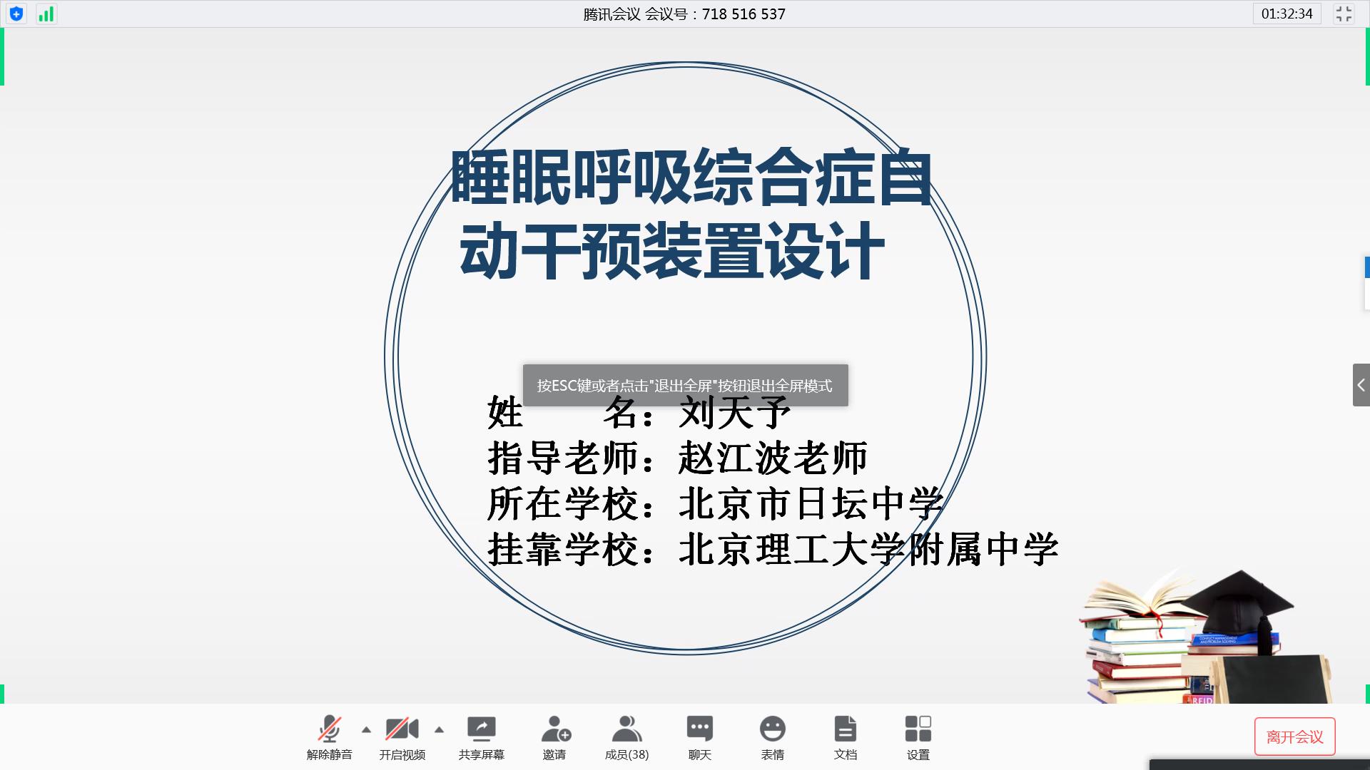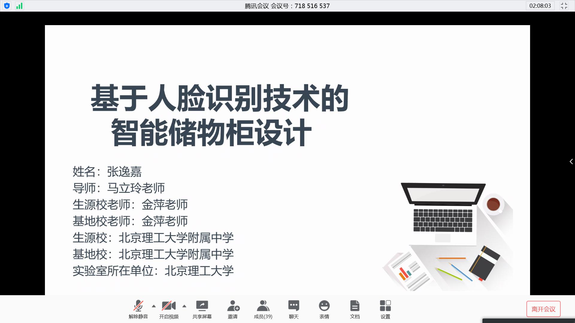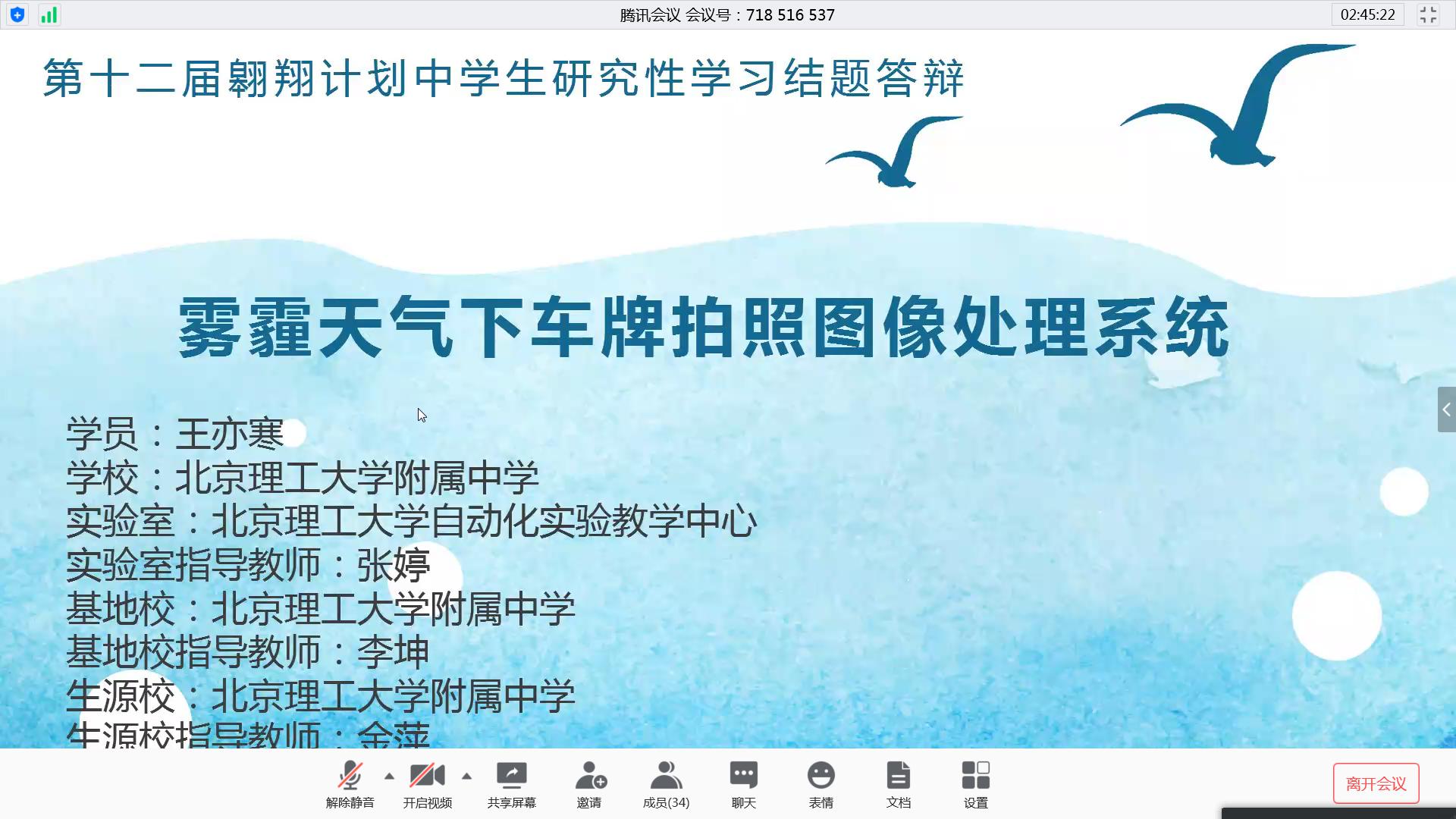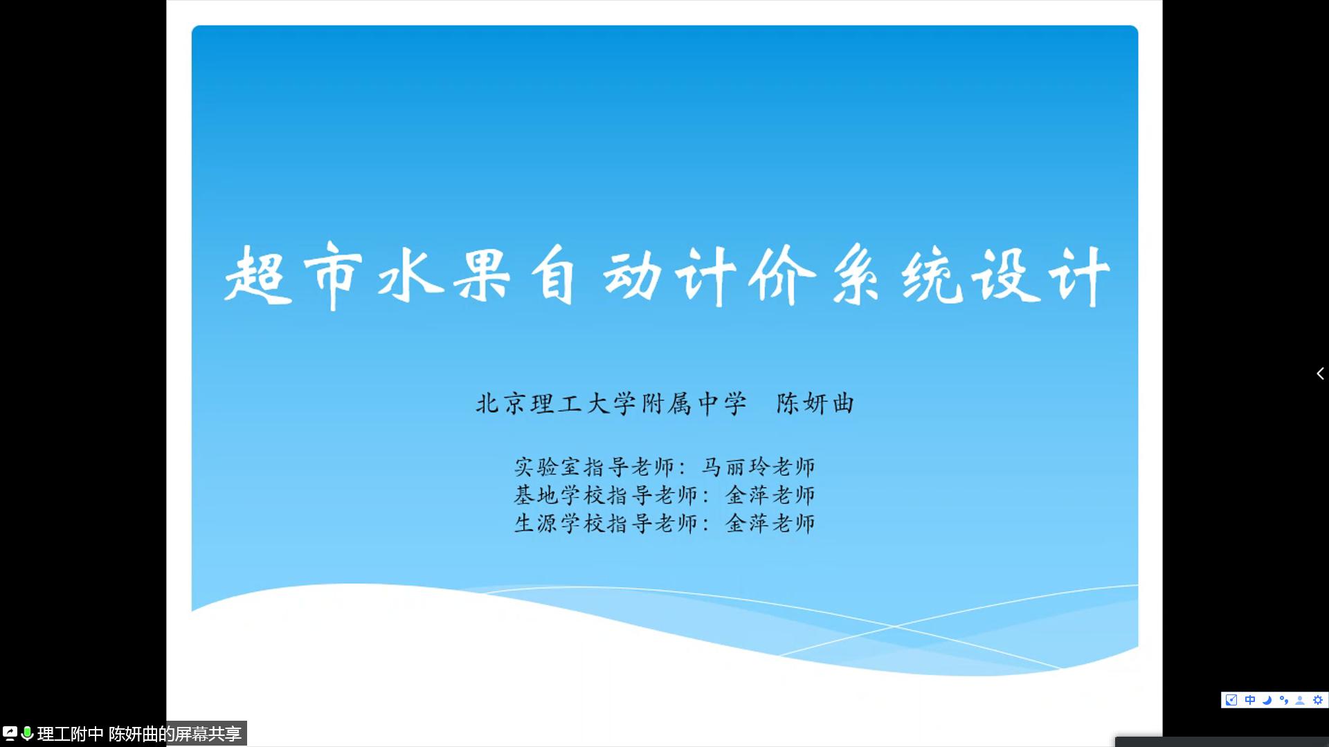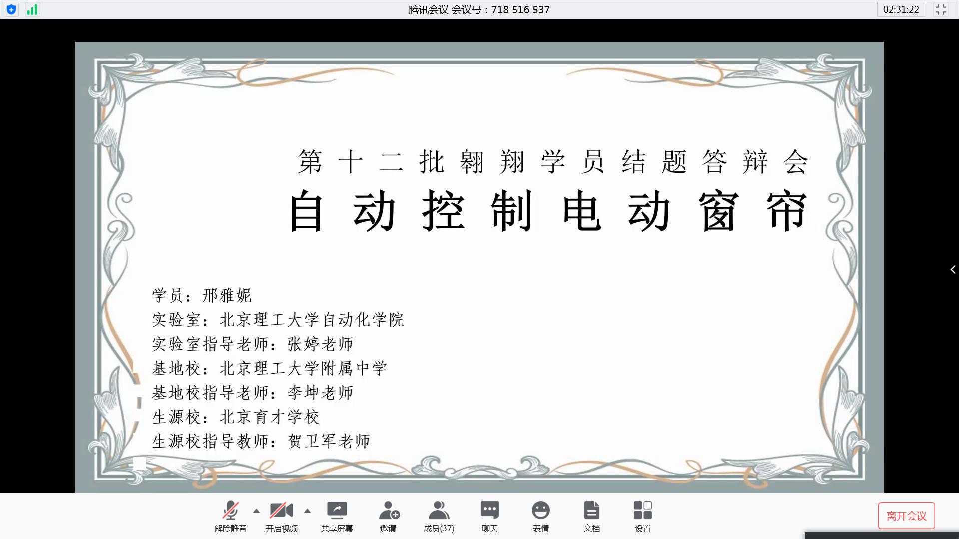 会议由北京理工大学附属中学金萍老师主持,北京理工大学机械与车辆学院清洁车辆实验室主任张幽彤教授、北京理工大学计算机学院智能信息技术实验室博士生导师刘峡壁、北京理工大学光电成像与信息工程研究所副所长王霞副教授、北京理工大学自动化学院教学实验中心张婷主任、北京理工大学光电学院光电信息与颜色工程研究所常军研究员、北京理工大学运动驱动与控制实验室马立玲和赵江波副教授、北京理工大学自动化学院自动控制系统实验室张佳老师担任评审专家。理工附中特色发展中心王雱主任、基地校指导老师马晓欣、李坤、齐利娟等在线参加了此次活动。第十二批学员进行了结题答辩,第十三批学员全程旁听了此次答辩会。北京青少年科技创新学院办公室张毅主任特别关注此次汇报,全程聆听了答辩,徐健、郭娜老师也一同参会。