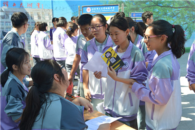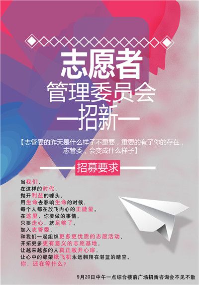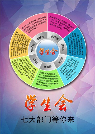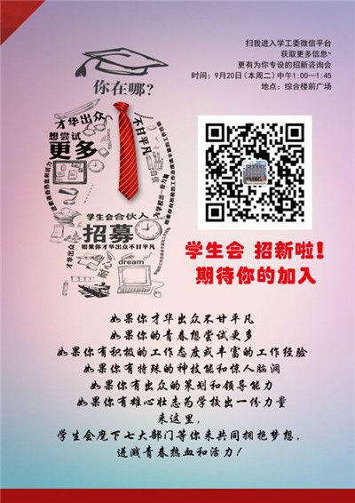 三大团体为保证本学年能够招募到优秀的同学,可谓各显其能。各自团体都制作了各具特色的宣传视频,张贴了自己的招新海报,早早的就在学校里预热起来。学生会的成员提前印好了各部门详细的职位介绍;志管委的学生向同学们分发自己的传单;社管委的同学则拿来了音响,现场造势,十分热闹。