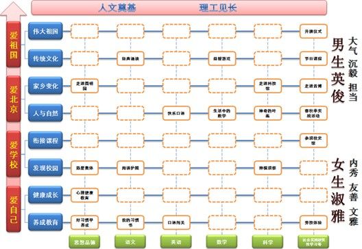 北京理工大学附属中学小学部在“人文奠基 理工见长”办学理念引领下,以“有教养守规矩 懂感恩 厚基础 重实践 会创造”为培养目标,我校一直十分重视校本课程的建设与创新。为满足学生不同的发展需求,培养学习兴趣,开发学生潜能,我校从“促进学生全面而有个性地发展”着手,构建了较为切实有效的课程体系。自2015年11月首批通过海淀区课程设置方案后,一直致力于课程改革的探索和实践,努力使学校的课程突出立德树人,聚合课程整体育人合力,突出课程融合,体现在学科实践活动的探索实践;学科知识相关内容的整合;有主题的跨学科内容的整合;突出学科核心素养的整合课程等,努力做到联系生活、符合学生阶段学习需要,发挥学科各自特点又能形成合力,促进学生全面而又个性的发展!经过一年的实践和摸索,骨干教师们编制了小学部课程设置方案中全部校本课程实施纲要,合力在实践中发现并打造出丰富多彩,富有特色,适合学生需求和发展的校本课程,能够让理工附中小学部的每一个学生真正有实际获得感,成长为“男生英俊 女生淑雅”具有理工附中气质的人。